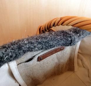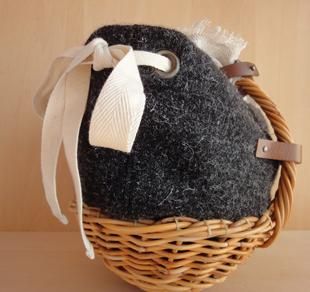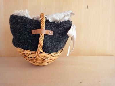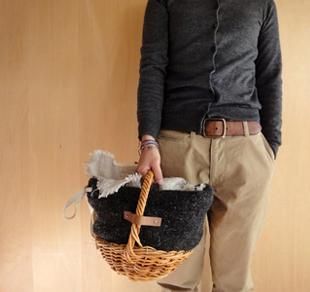 しっかりとしたウールツィードを使用したBASKETです。持ち手の付いた手編みの紅藤を使っています。生成りの裏地付き、麻色の内ポケットが一つ付いています。